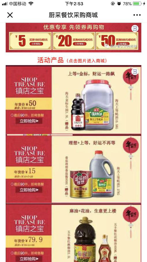2.向市场借力,学会创新营销,孟总摒弃了传统企业传统简单的销售思维,从销售思维向营销思维、服务思维转化,由于调味品行业具有很强的区域性,客户复购率特别高,平均1个客户一周的订货会在3次以上,利用易订货的营销活动,不断的使用优惠活动,商品促销、买赠、秒杀等来吸引客户下单,及时利用节日热点做优惠,端午,中秋、国庆吸引客户下单,例如“厨采中秋815,登录就送券”“年货节,除了领劵,还有大优惠”等活动,都非常有效的提高了销量并且增加了客户粘性,
