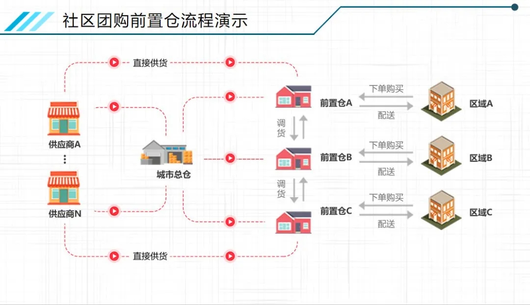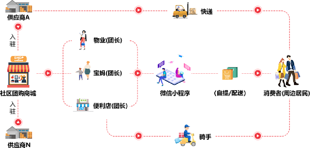 这也是当前社区团购的主流模式(次日达|预售+自提,解决性价比问题):供应商入驻平台,商家招募团长,团长利用微信群或朋友圈等方式引导居民预售下单,由平台统一配送到团长,消费者次日就可以进行自提。