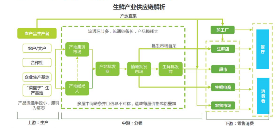 传统的生鲜供应链 :环节多,链条长,耗损大。