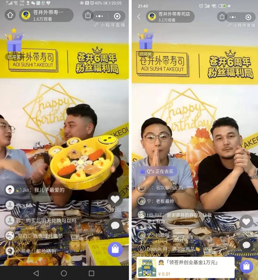 近日,在全国拥有300+连锁门店的“苍井外带寿司”,通过哗啦啦小程序直播完成了首次小程序直播试水。