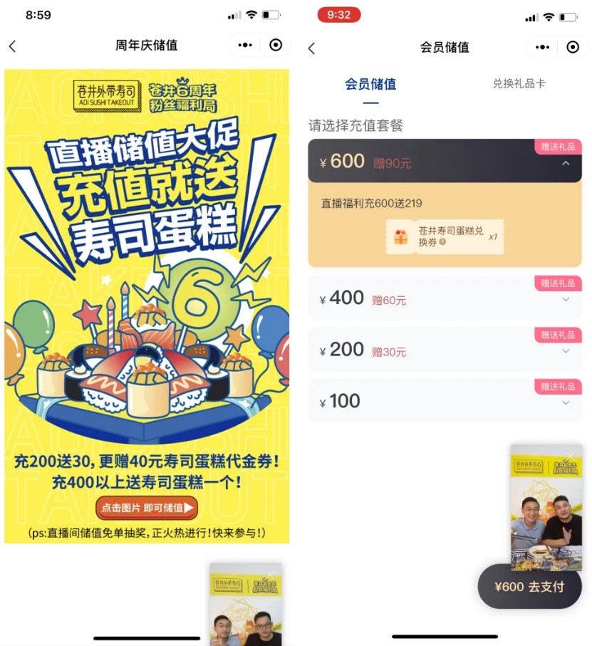 直播中,“苍井外带寿司”推出了分享领券、超低价单品秒杀、经典套餐优惠促销、抽奖、会员储值免单等多样化的营销活动,直播2个半小时,实现营收超10万元,新增会员近1000人,带动加盟咨询量提升20%,门店客流提升30%,超出预期。