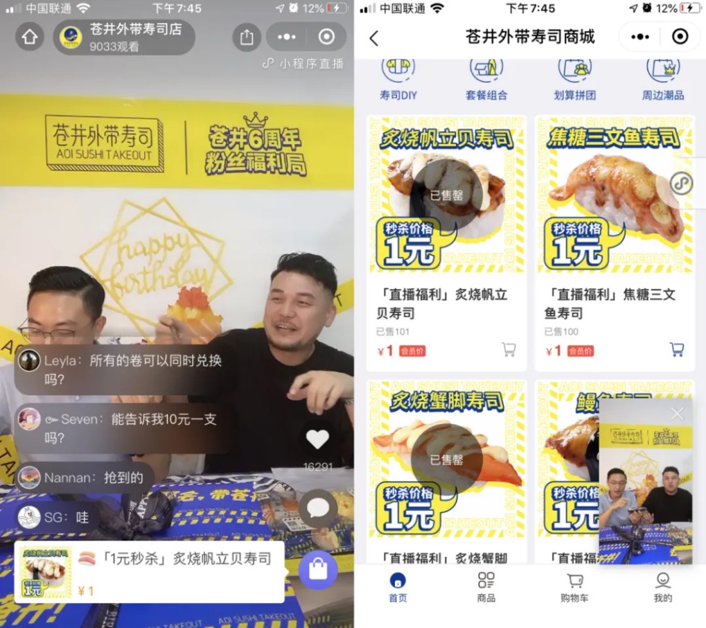 “事实上,在哗啦啦之前,我们也和其他平台合作尝试过小程序直播,但是由于对方系统不稳定,导致直播过程卡顿暂停多次,所以没有成功,这次哗啦啦小程序直播还是比较成功的,结果我们也很满意。”苍井外带寿司相关负责人说。